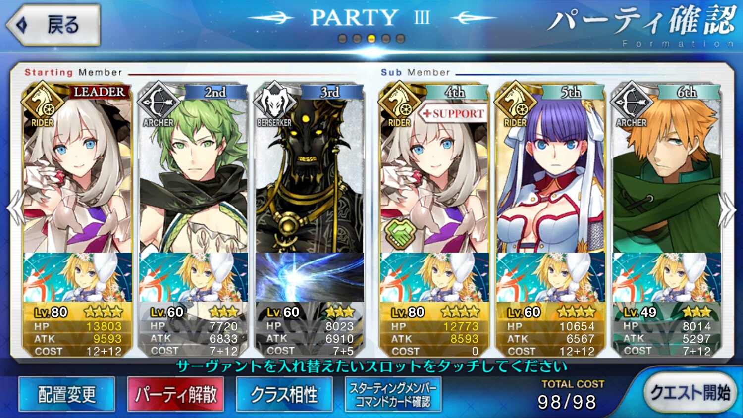 マリーはもともとガッツリそだてていて、最初に最終再臨、レベルマックスまで持って行ったサーヴァントだったのでかなり活躍してくれました。
