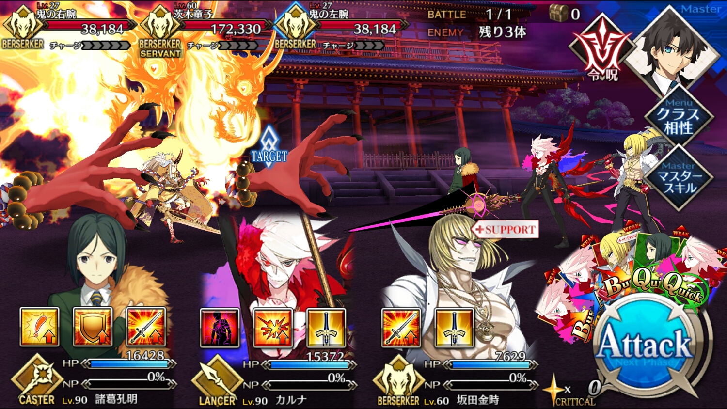 ただ、運悪く茨木童子のクリティカルを食らったり、孔明1人に攻撃が集中するときつくなりましたね。